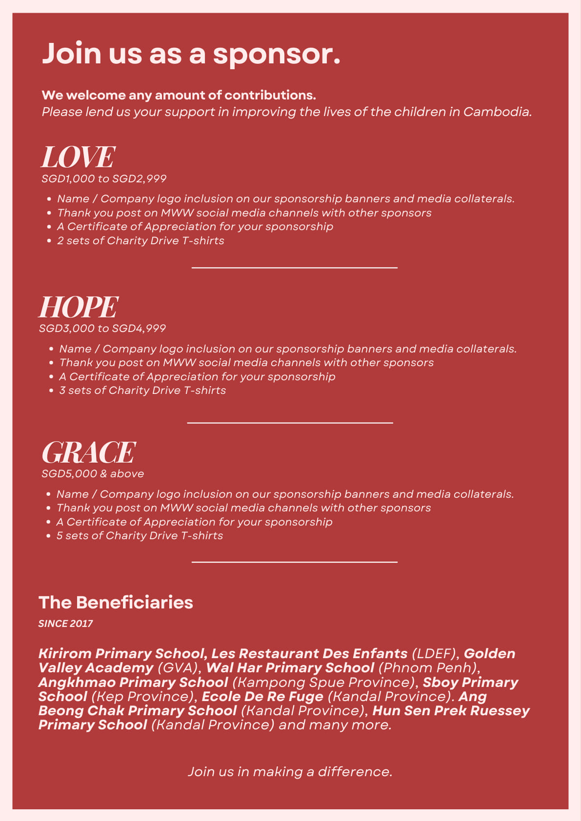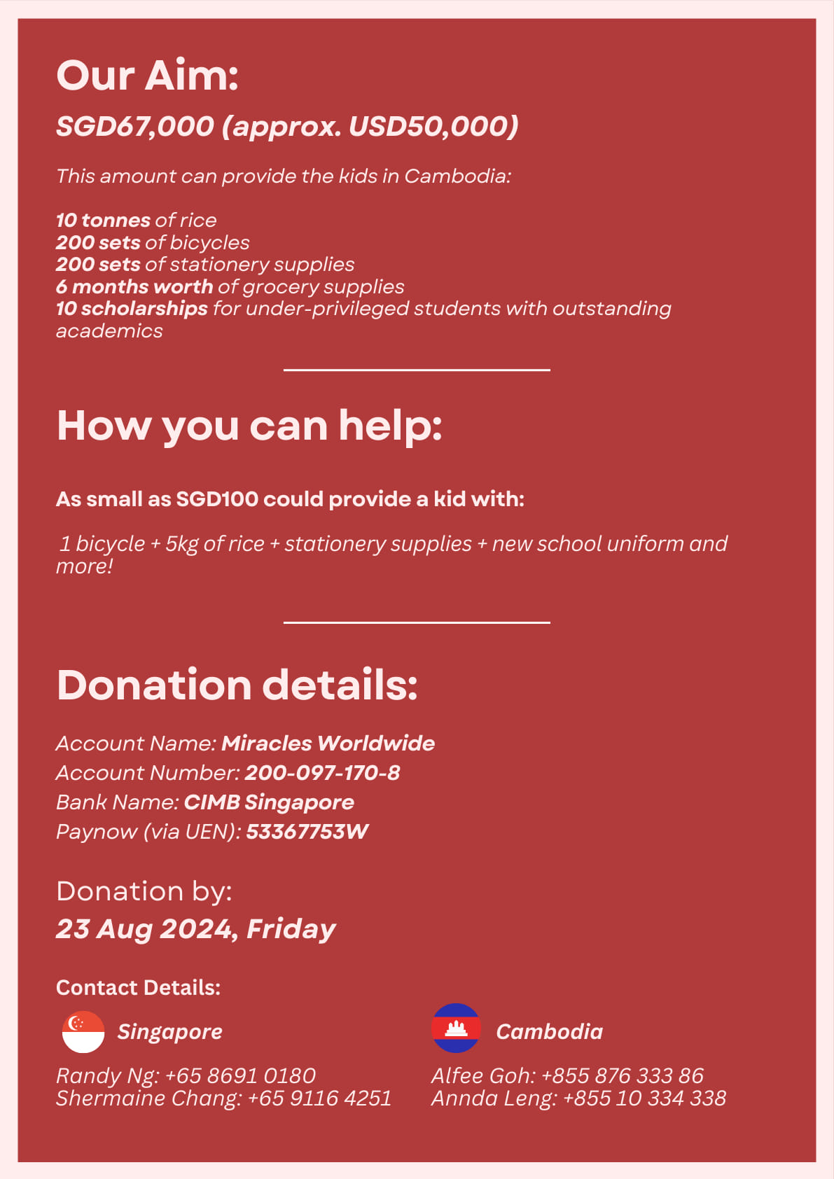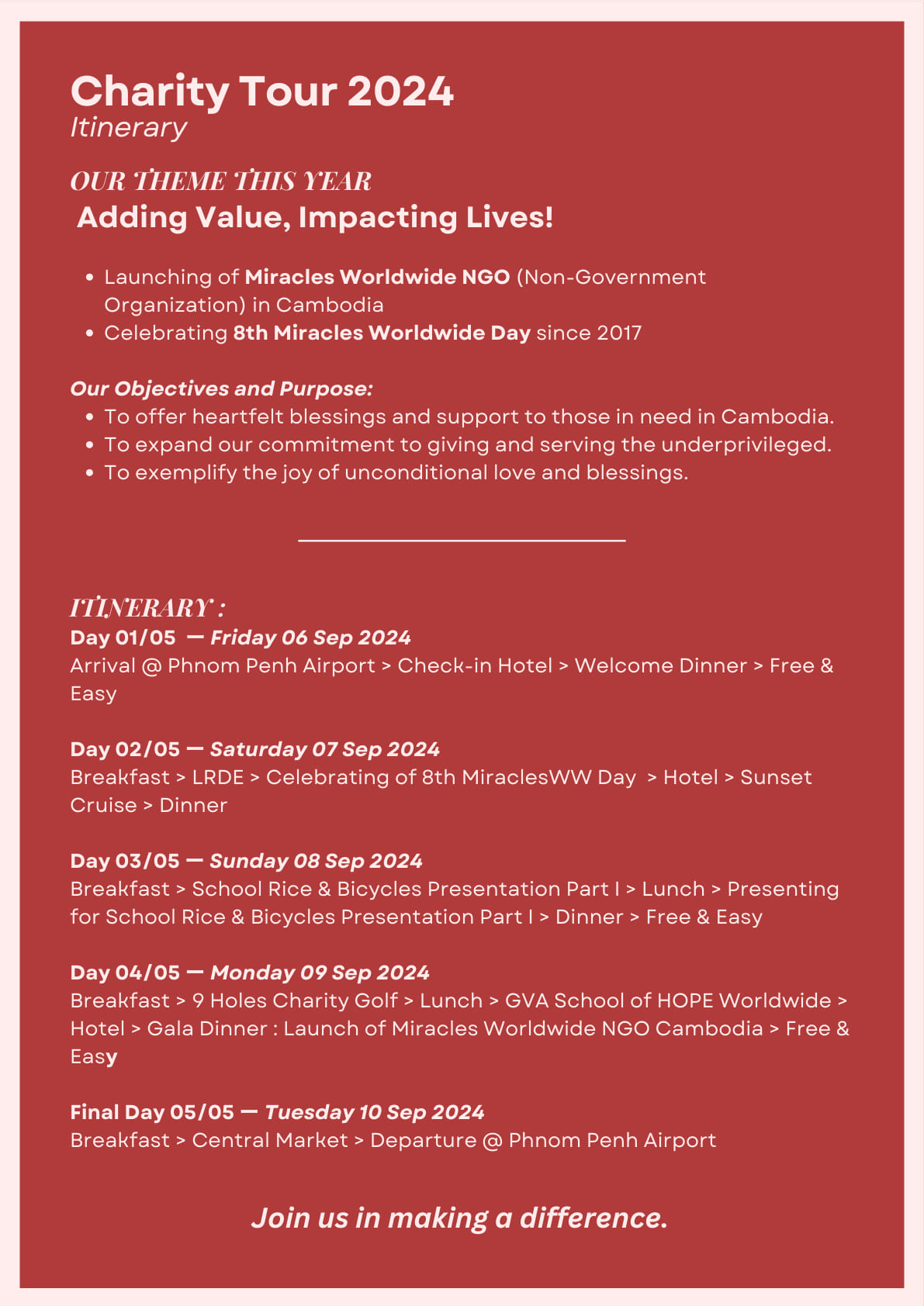 06-10 September 2024 will be mark our 8th anniversary of Charity Mission Tour in Phnom Penh Cambodia. Our Singapore & Cambodia Teams are excited about this coming project. This year theme will be "Adding Value, Impacting Lives" ! Please do contact us, if you want to donate or support in our this charity project. We are giving 300 bicycles, 10 bursaries, groceries (Rice/ Meats/ Cooking Oil/ Noodles, etc), school uniforms and etc. We believe as long as our heart of giving and serving the needy, many great miracle gonna happen !